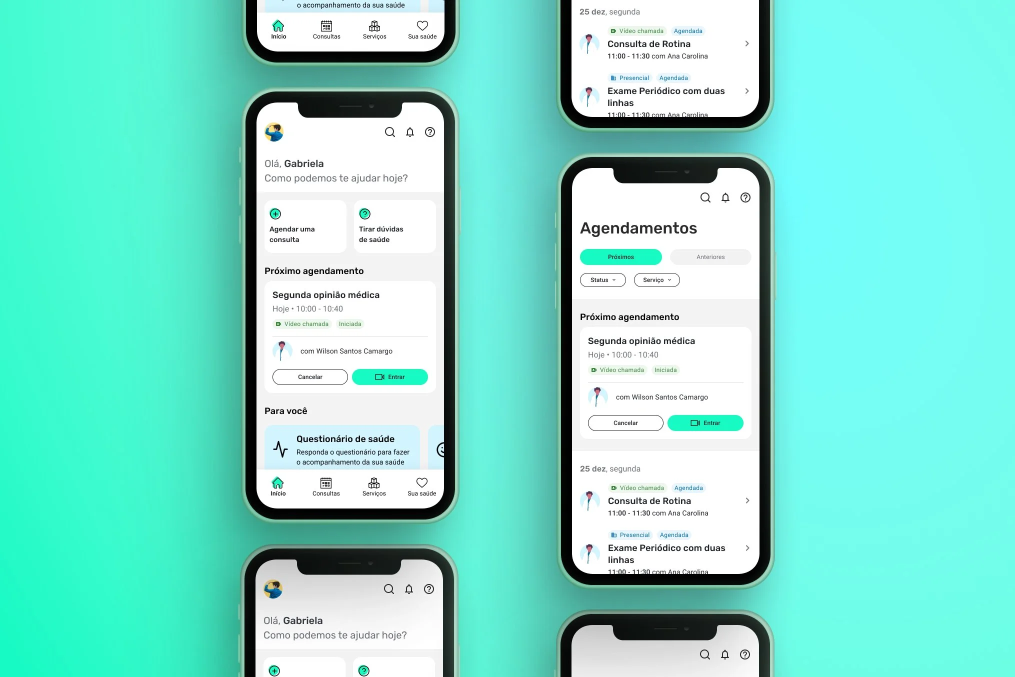 Based on the wireframe, I was able to start working with prototypes in high fidelity. The colours followed the branding (with minor changes) and the iconography was worked in rounded and minimalist shapes to simplify the layout and have fast understanding. All contents were written in order to approach the patient to the Agatha in a conversational structure.